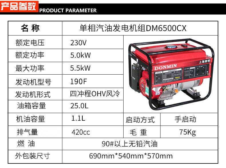 * 表示(shì)必(bì)填采(cǎi)購:單相 5kW小(xiǎo)型汽油發電機組(zǔ) DM6500CX手動(dòng)