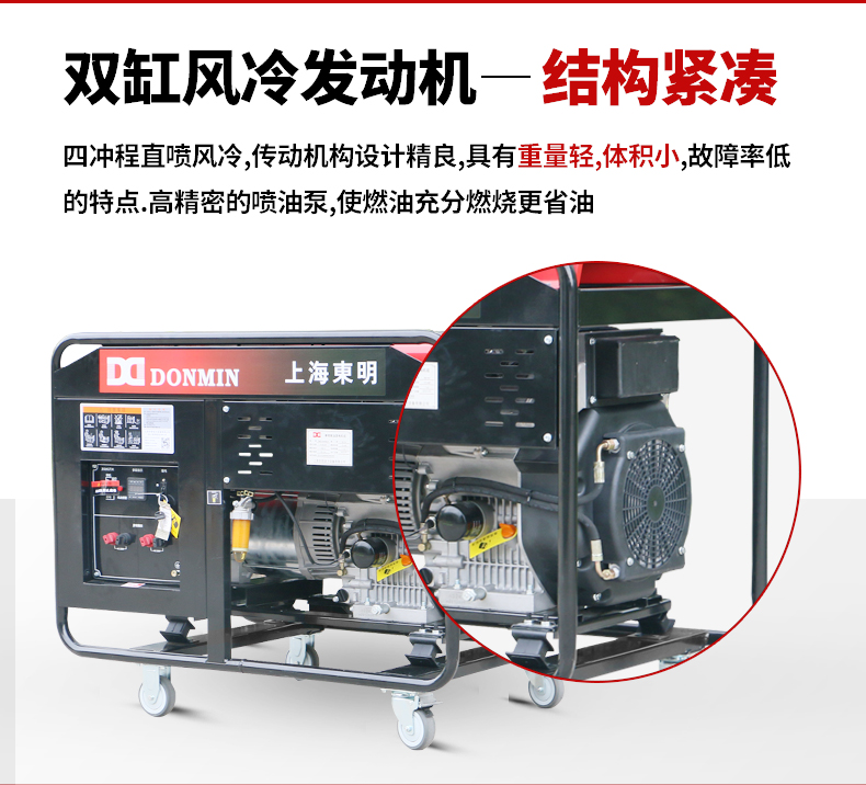 - 上海大香蕉污视频15KW 15000W柴油發電機組DMD18000LE ◆采用雙缸V型(xíng)柴油動力,精密噴油泵,燃燒充分、省油、動力強勁; ◆大型消音器,動平衡(héng)轉軸(zhóu),低噪音機組特殊設計,采用具有減震功能的外殼與框架(jià); ◆大容量油箱確保長時(shí)間的連續工作; ◆無熔絲斷路器提供過載保護,電容電壓調節器,確(què)保穩定電壓(yā)輸出; ◆耐用的四輪拖動式底(dǐ)座結構,移(yí)動方便。